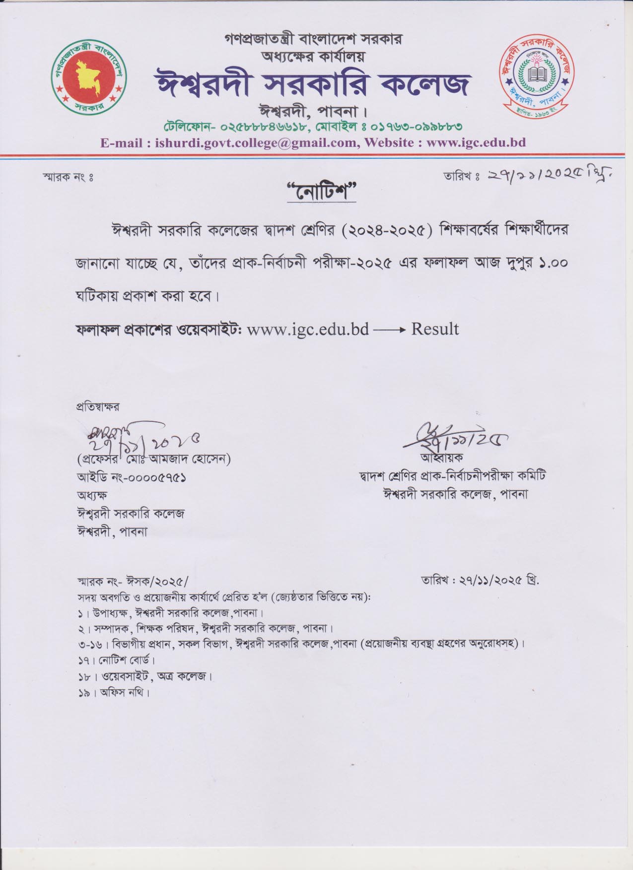 দ্বাদশ শ্রেণির (২০২৪-২৫) শিক্ষাবর্ষের প্রাক-নির্বাচনী পরীক্ষার ফলাফল প্রকাশ সংক্রান্ত নোটিশ