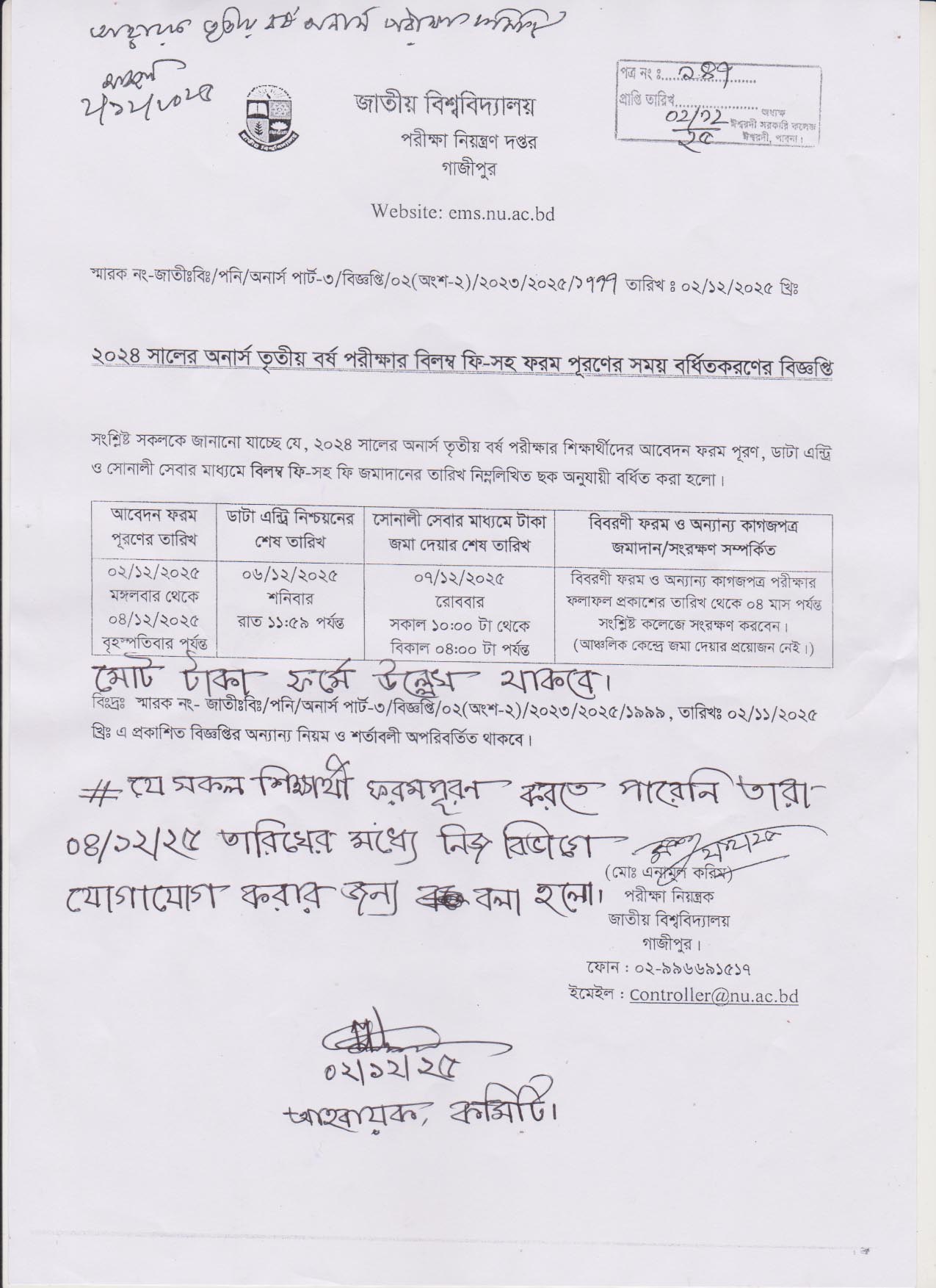 অনার্স ৩য় বর্ষ বিলম্ব ফিসহ ফরমপূরণের নোটিশ